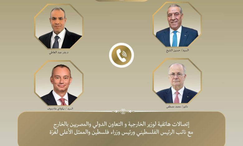 جرت اتصالات هاتفية بين د. بدر عبد العاطي وزير الخارجية والتعاون الدولي والمصريين بالخارج، مع كل من حسين الشيخ نائب الرئيس الفلسطيني، والدكتور محمد مصطفى رئيس الوزراء الفلسطيني، و نيكولاي ملادينوف الممثل الأعلى لغزة، وذلك لبحث مستجدات القضية الفلسطينية والأوضاع في قطاع غزة والضفة الغربية.