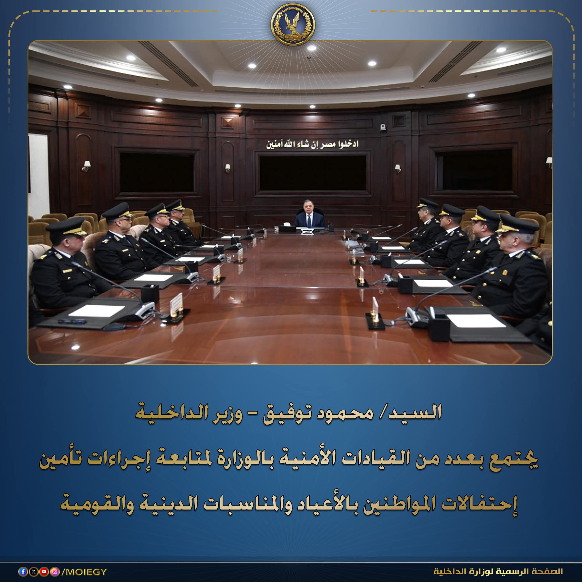 عقد السيد/ محمود توفيق – وزير الداخلية إجتماعاً مع عدد من مساعدى الوزير والقيادات الأمنية ، بمقر مركز المعلومات وإدارة الأزمات بوزارة الداخلية، وتم التواصل مع مديرى الأمن وقيادات الأجهزة الأمنية بمواقعها على مستوى الجمهورية عبر تقنية (الفيديو كونفرانس)، لإستعراض محاور الخطط الأمنية خلال المرحلة الحالية وما تحققه لحماية أمن وسلامة المواطنين .