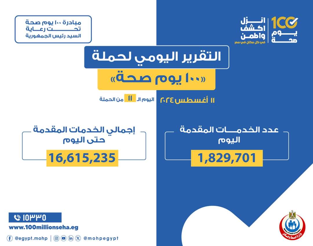 أعلن الدكتور خالد عبدالغفار نائب رئيس مجلس الوزراء ووزير الصحة والسكان، تقديم 16 مليون و615 ألفا و235 خدمة طبية من خلال حملة «100 يوم صحة» منذ إطلاق الدكتور مصطفى مدبولي رئيس مجلس الوزراء، للنسخة الثانية، مساء يوم 31 يوليو 2024، وحتى مساء أمس الأحد 11 أغسطس، في جميع محافظات الجمهورية، برعاية الرئيس عبدالفتاح السيسي.