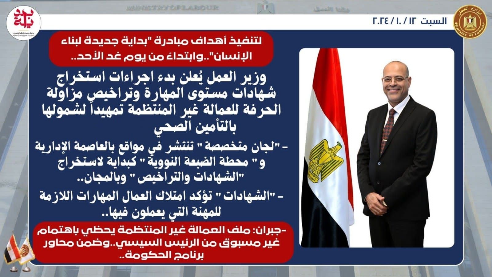 أعلن محمد جبران وزير العمل اليوم السبت، عن البدء من يوم غد الأحد، في نزول “لجان متخصصة”، من إدارتي “العمالة غير المنتظمة”،و”التدريب المهني”، ومديريتي عمل القاهرة ،ومطروح ،بالتنسيق مع هيئتي” التأمينات الاجتماعية “،و”التأمين الصحي”،الى بعض مواقع للعمالة غير المنتظمة في العاصمة الإدارية الجديدة،ومشروع محطة الضبعة النووية،لاختبارهم ،واستخراج شهادات قياس مستوى المهارة،وتراخيص مزاولة الحرفة لهم،وبالمجان،حيث سيتم خصم الرسوم المطلوبة لاستخراج تلك الشهادات ،من الحساب المركزى للرعاية الصحية و الاجتماعية للعمالة غير المنتظمة بوزارة العمل ،وذلك تمهيداً لشمولهم بمظلة التأمين الصحي،حيث ستتحمل وزاره العمل جزء من تكلفة “التأمين” عليهم، بالتنسيق مع وزارة التضامن…ويأتي ذلك في إطار مشاركة “الوزارة” في تنفيذ أهداف المبادرة الرئاسية “بداية جديدة لبناء الإنسان”،والتي من بينها “التوسع في مد مظلة الحماية الاجتماعية والصحية للعمالة غير المنتظمة”..