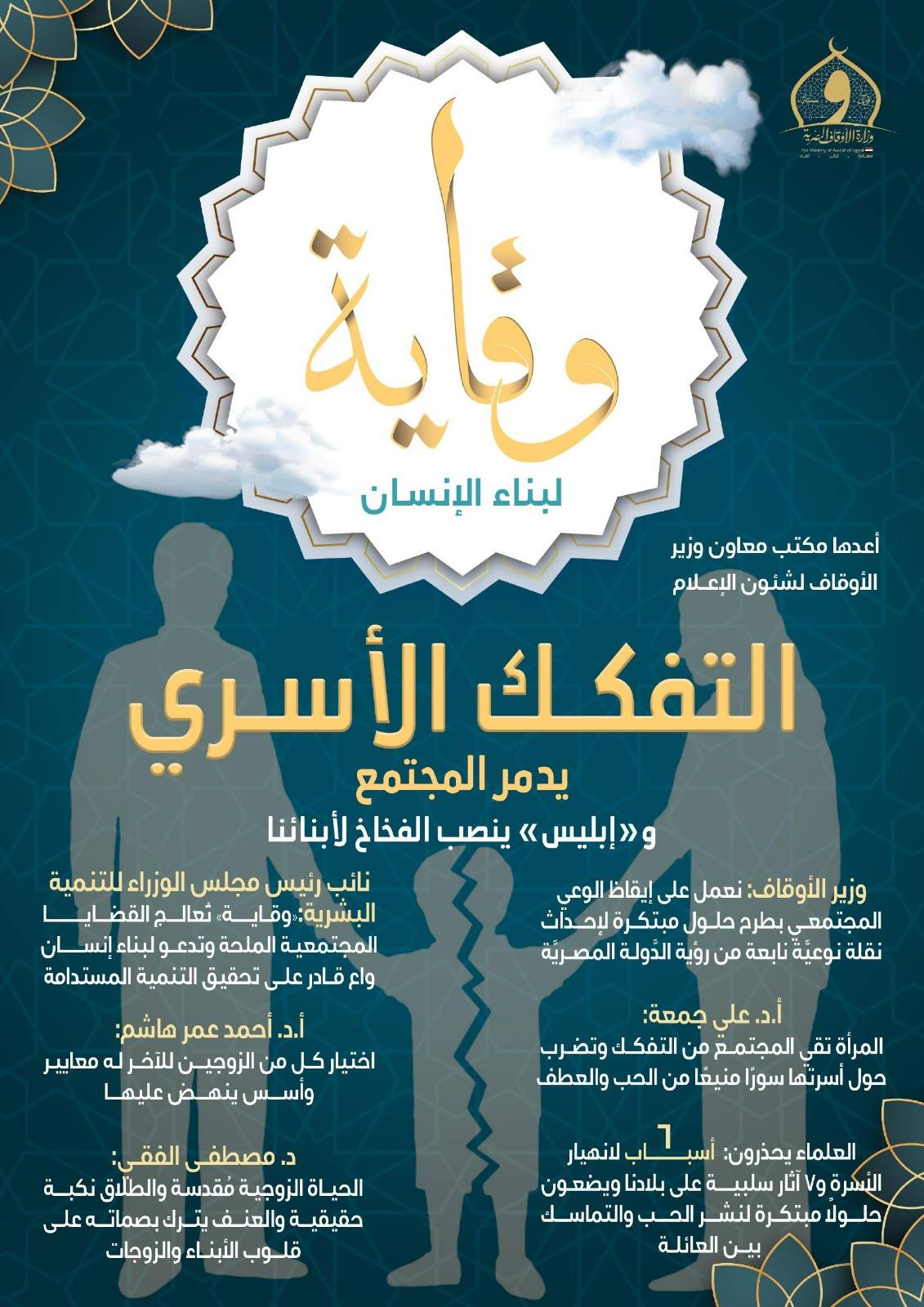 وضمت «وقاية» في عددها العديد من المقالات التي تناقش قضية التفكك الأسري، منها: مقال أ.د/ علي جمعة، عضو هيئة كبار العلماء بالأزهر الشريف، وأ.د/ أحمد عمر هاشم عضو هيئة كبار العلماء بالأزهر الشريف، والشيخ خالد الجندي، عضو المجلس الأعلى للشئون الإسلامية، والدكتور عمرو الورداني، أمين الفتوى بدار الإفتاء المصرية.