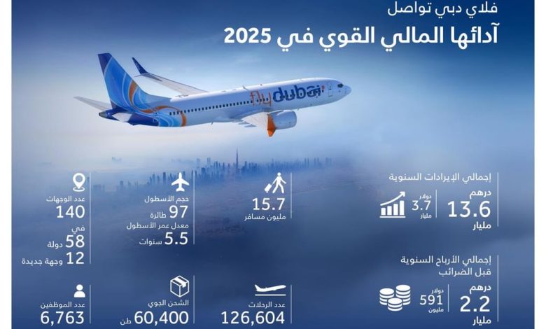 حققت فلاي دبي صافي أرباح بعد الضريبة بواقع 1.9 مليار درهم “531 مليون دولار”، في سنتها المالية المنتهية في 31 ديسمبر 2025، فيما سجلت أرباحاً قبل الضريبة بلغت 2.2 مليار درهم “591 مليون دولار”.