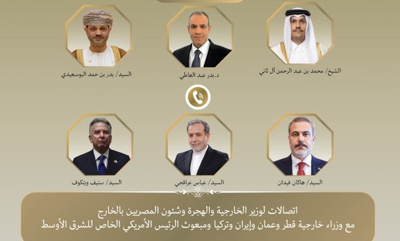 في إطار تنفيذ توجيهات السيد رئيس الجمهورية بخفض التصعيد في منطقة الشرق الأوسط، أجرى د. بدر عبد العاطي وزير الخارجية والهجرة وشئون المصريين بالخارج اتصالات مكثفة بكلٍ من السيد “عباس عراقجي” وزير خارجية إيران، والسيد “ستيف ويتكوف” المبعوث الأمريكي الخاص للشرق الأوسط، والشيخ “محمد بن عبد الرحمن”، رئيس وزراء ووزير خارجية قطر، والسيد “هاكان فيدان”، وزير خارجية تركيا، والسيد “بدر بن حمد البوسعيدي”، وزير خارجية سلطنة عمان، حيث تناولت الاتصالات المستجدات بالمنطقة في ظل تصاعد حدة التوتر بالإقليم.
