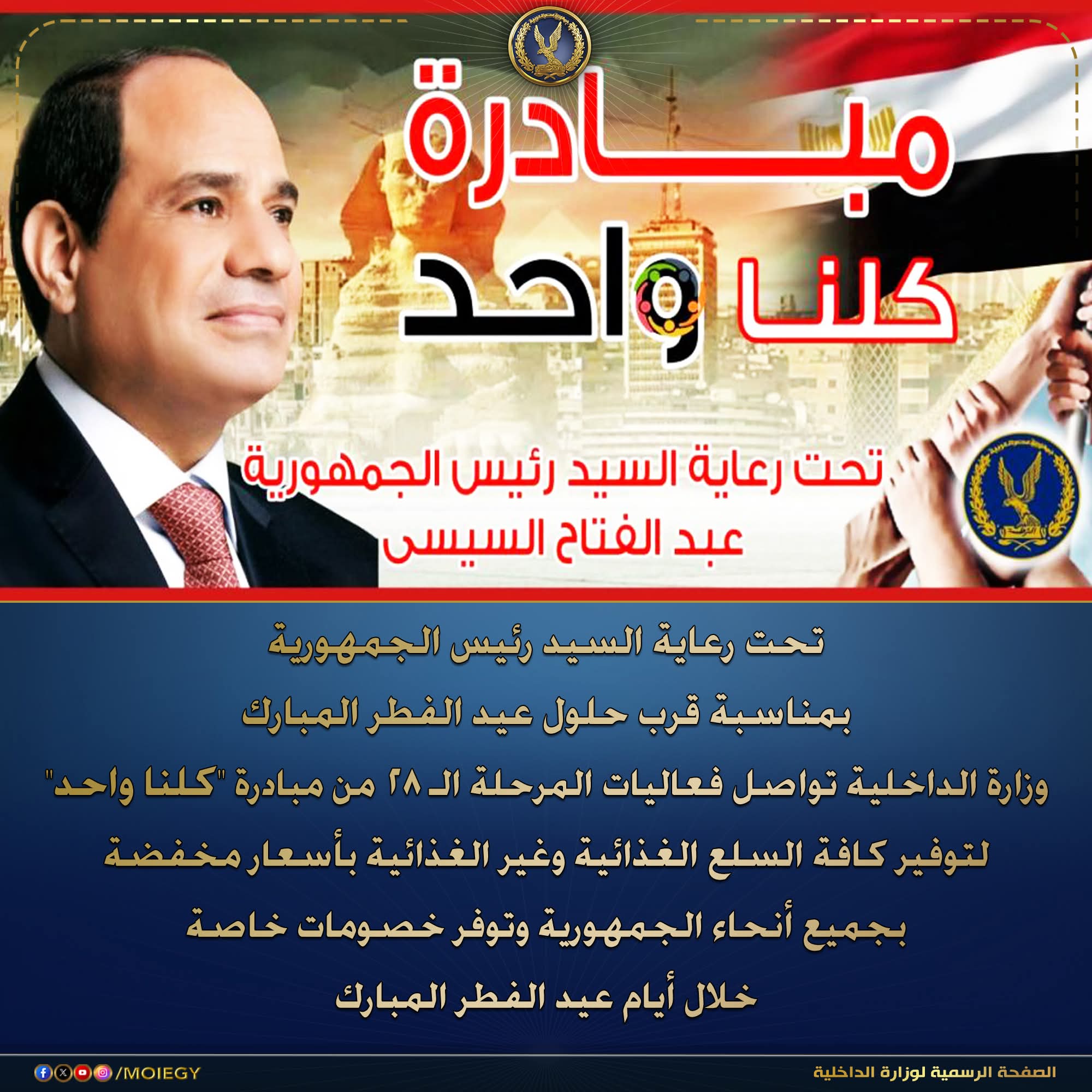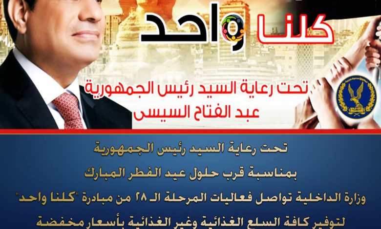 فى إطار توجيهات القيادة السياسية لإتخاذ كافة الإجراءات اللازمة لدعم منظومة الحماية الإجتماعية للمواطنين.. وبمناسبة قرب حلول عيد الفطر المبارك، تحت رعاية السيد رئيس الجمهورية وزارة الداخلية تواصل فعاليات المرحلة الـ (28) من مبادرة (كلنا واحد) لتوفير كافة مستلزمات الأسرة المصرية من السلع الغذائية وغير الغذائية بجودة عالية وبأسعار مخفضة بنسبة تصل إلى 40% على السلع الغذائية، ومنتجات الشركات التجارية والصناعية بالتنسيق مع مختلف قطاعات الوزارة ومديريات الأمن على مستوى الجمهورية بالمنافذ والسرادقات الموضحة على الموقع الرسمى لوزارة الداخلية www.moi.gov.eg