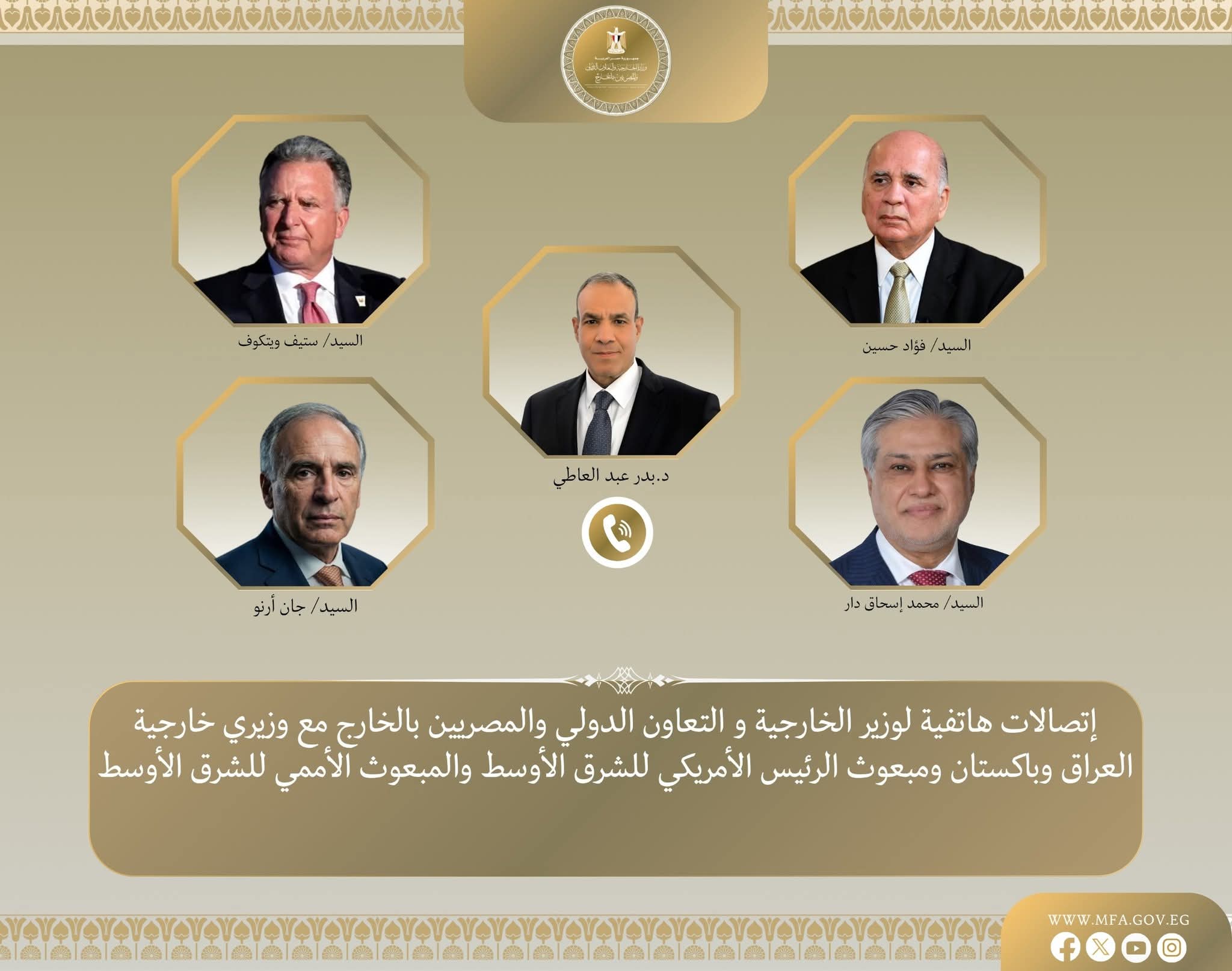 فى إطار جهود خفض التصعيد واحتواء الموقف العسكرى المتصاعد بالمنطقة، واصل د. بدر عبد العاطي وزير الخارجية والتعاون الدولي والمصريين بالخارج اتصالاته المكثفة حيث جرت اتصالات بين وزير الخارجية مع د. فؤاد حسين نائب رئيس مجلس الوزراء وزير خارجية جمهورية العراق، والسيد محمد إسحاق دار نائب رئيس الوزراء ووزير خارجية باكستان، والسيد ستيف ويتكوف المبعوث الأمريكي الخاص للشرق الأوسط، والسيد جان أرنو المبعوث الشخصي للسكرتير العام للأمم المتحدة للشرق الأوسط يوم الاثنين ٦ أبريل.