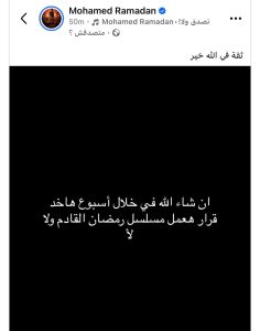أثار الفنان محمد رمضان فضول متابعيه بشأن مشاركته في موسم رمضان المقبل، حيث كتب عبر حسابه على فيسبوك: «إن شاء الله خلال أسبوع هاخد قرار هعمل مسلسل رمضان القادم ولا لأ، ثقة في الله خير».