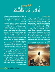 وفى فقرة آية ودرس موضوع بعنوان (فرادى كما خلقناكم)