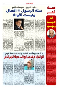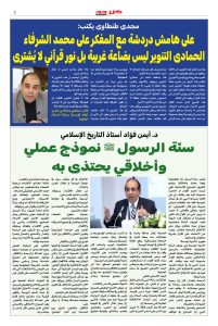 كما تضمن العدد مقالان للمدير العام لمؤسسة رسالة السلام العالمية الكاتب والإعلامي الأستاذ مجدي طنطاوي، الأول حول نور القرآن وزيف التنوير، والثاني حول مصر العصية على التغيير