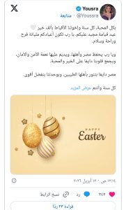 وكتبت يسرا عبر حسابها على منصة “إكس”: “بكل المحبة، كل سنة وإخوتنا الأقباط بألف خير، عيد قيامة مجيد عليكم، يا رب تكون أعيادكم مليانة فرح وراحة وسلام… ويا رب يحفظ مصر وأهلها ويجمع قلوبنا دايمًا على الخير والمحبة”، مؤكدة على وحدة المصريين وتماسكهم.