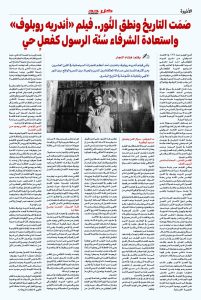 بالصفحة الأخيرة التي تشتبك مع المشهدين الفني والثقافي مقال تحليلي ونقدي لرئيس مجلس تحرير المجلة الكاتب الصحفي والأديب هشام النجار بعنوان (صمت التاريخ ونطق النور.. فيلم أندريه ربوبلوف واستعادة الشرفاء سنة الرسول كفعل حي)