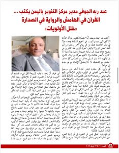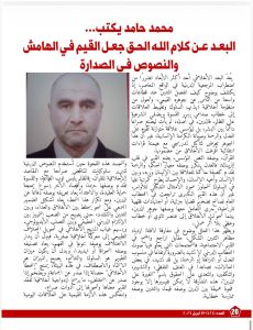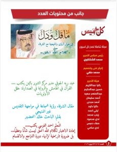 تصدر العدد مقال المفكر العربى الأستاذ علي محمد الشرفاء الحمادي بعنوان «كلامُ اللهِ هوَ الحقُّ»، ويطرح فيه رؤيةً تجعل القرآنَ الميزانَ الأعلى الذي تُوزَن به الأقوالُ والتصورات، مستندًا إلى آياتٍ قرآنيةٍ عديدةٍ تُحذِّر من الإعراض عن الذكر واتباع أولياء من دون الله.