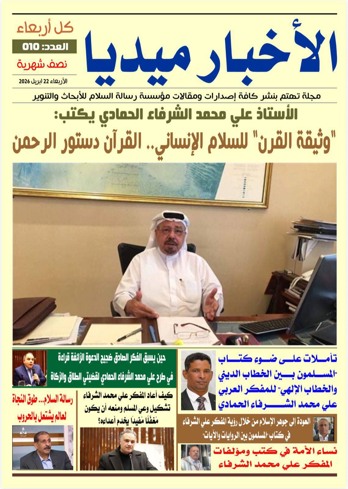 صدر العدد الجديد من مجلة “الأخبار ميديا” التى تصدر – نصف شهرية والعدد الجديد يحمل رقم 10 بتاريخ الأربعاء 22 أبريل 2026)، وهي مجلة تهتم بنشر إصدارات ومقالات مؤسسة رسالة السلام العالمية .