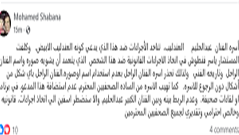 وقال في المنشور: «أسرة الفنان عبدالحليم حافظ (العندليب) تتخد الإجراءات ضد هذا الذي يدعي كونه العندليب الأبيض، وكلفت المستشار ياسر قنطوش باتخاذ الإجراءات القانونية ضد هذا الشخص الذي يتعمد أن يشوه صورة واسم الفنان الراحل وتاريخه الفني».