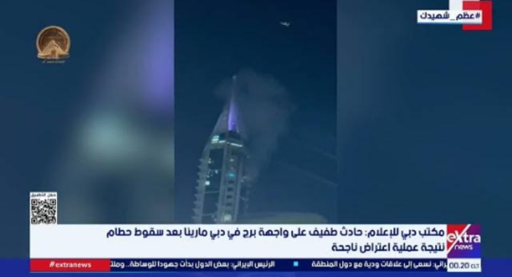 مكتب دبي للإعلام: حادث طفيف على واجهة برج في دبي مارينا بعد سقوط حطام نتيجة عملية اعتراض ناجحة