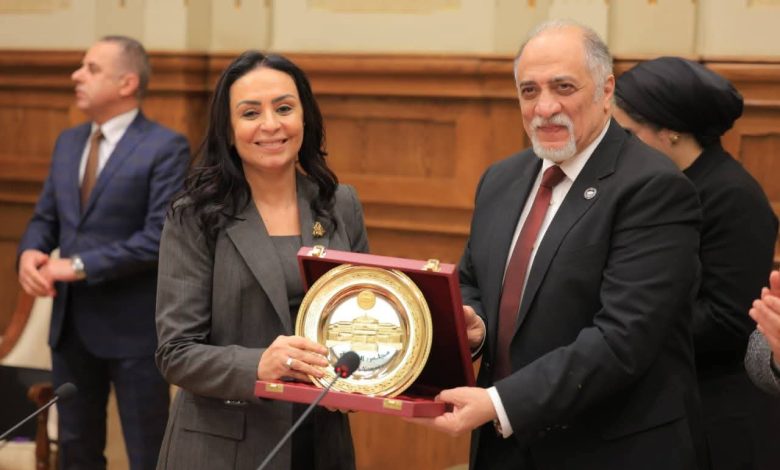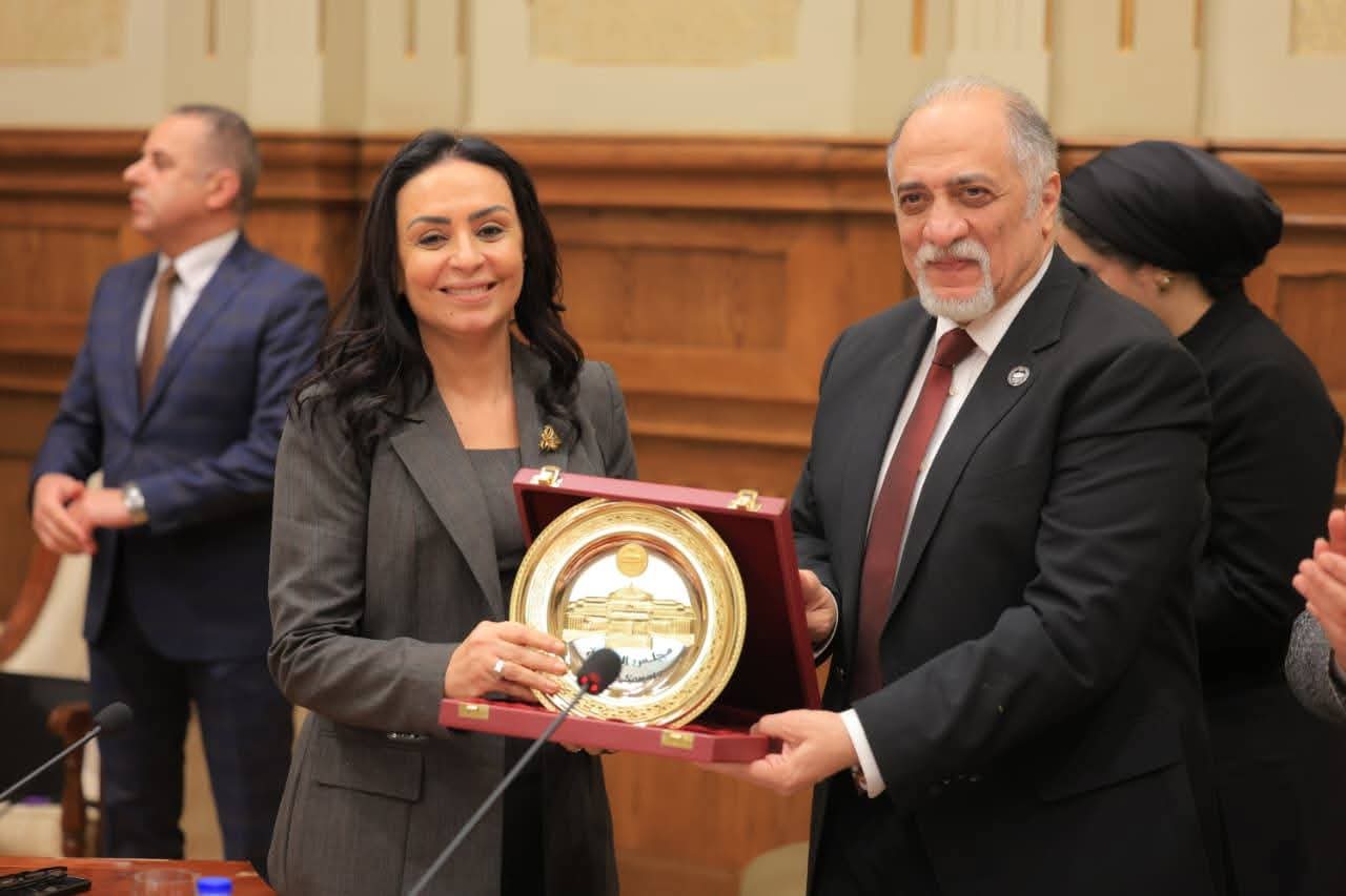 وأهدت وزيرة التضامن الاجتماعي درع الهلال الأحمر المصري للدكتور الهادي القصبي رئيس لجنة حقوق الإنسان والتضامن الاجتماعي بمجلس الشيوخ .