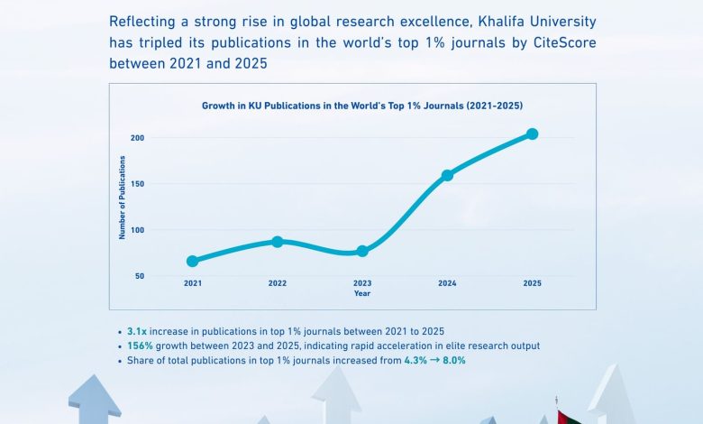 وعلى صعيد المجلات المصنفة ضمن فئات أوسع، تضاعف عدد البحوث المنشورة في أفضل 5% من المجلات بمقدار 2.5 مرة بين عامي 2021 و2025، حيث زادت نسبتها إلى إجمالي الإنتاج البحثي من 21.1 % إلى 32 %، وبحلول عام 2025، نُشِر أكثر من نصف مخرجات جامعة خليفة البحثية “57.5%” في أفضل 10% من المجلات العلمية وفقًا لمؤشر “سايت سكور”، مما يعكس تقدمًا مطردًا نحو نشر بحوث علمية عالية التأثير في مختلف التخصصات.