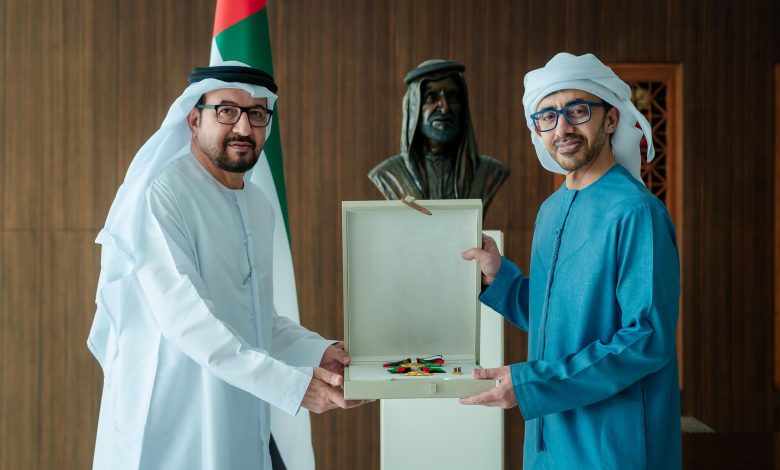 وقام سمو الشيخ عبدالله بن زايد آل نهيان، نائب رئيس مجلس الوزراء وزير الخارجية، بتقليد الوسام لسعادة سيف محمد الزعابي، وذلك خلال استقباله له اليوم في ديوان عام الوزارة بأبوظبي.
