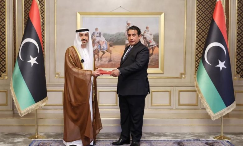 قدم سعادة علي راشد أحمد المزروعي أوراق اعتماده إلى فخامة الدكتور محمد يونس المنفي رئيس المجلس الرئاسي بدولة ليبيا الشقيقة، سفيرا لدولة الإمارات لدى دولة ليبيا.ونقل سعادته تحيّات صاحب السمو الشيخ محمد بن زايد آل نهيان رئيس الدولة، “حفظه الله”، وصاحب السمو الشيخ محمد بن راشد آل مكتوم نائب رئيس الدولة رئيس مجلس الوزراء حاكم دبي، “رعاه الله”، وسمو الشيخ منصور بن زايد آل نهيان نائب رئيس الدولة نائب رئيس مجلس الوزراء رئيس ديوان الرئاسة، إلى فخامته وتمنياتهم لبلاده وشعبه بالمزيد من التقدم والازدهار.من جانبه حمّل فخامة رئيس المجلس الرئاسي الليبي سعادة السفير تحيّاته إلى صاحب السمو الشيخ محمد بن زايد آل نهيان رئيس الدولة، “حفظه الله”، وصاحب السمو الشيخ محمد بن راشد آل مكتوم نائب رئيس الدولة رئيس مجلس الوزراء حاكم دبي، “رعاه الله”، وسمو الشيخ منصور بن زايد آل نهيان نائب رئيس الدولة نائب رئيس مجلس الوزراء رئيس ديوان الرئاسة، وتمنياته لدولة الإمارات قيادةً وحكومةً وشعباً بمزيد من النماء والتطور.وتمنى فخامته لسعادة السفير التوفيق في مهام عمله، وتطوير العلاقات الثنائية وتعزيزها في مختلف المجالات التي تجمع البلدين، مؤكدا استعداد بلاده لتقديم كل دعم ممكن لتسهيل مهامه.من جهته أعرب سعادة المزروعي عن اعتزازه بتمثيل دولة الإمارات لدى دولة ليبيا، وحرصه على تعزيز العلاقات الثنائية بين البلدين وتفعيلها في شتى المجالات، بما يسهم في دعم أواصر العلاقات الأخوية بين البلدين الشقيقين.وتم خلال اللقاء استعراض مجالات التعاون بين دولة الإمارات وليبيا، وبحث سبل تنميتها وتطويرها، بما يحقق مصالح وطموحات البلدين والشعبين الصديقين.