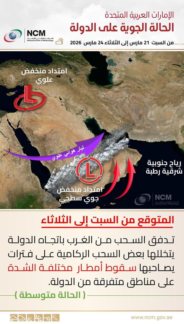 “الوطني للأرصاد” يتوقع تدفق سحب ممطرة على الدولة من 21 إلى 24 مارس